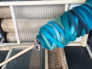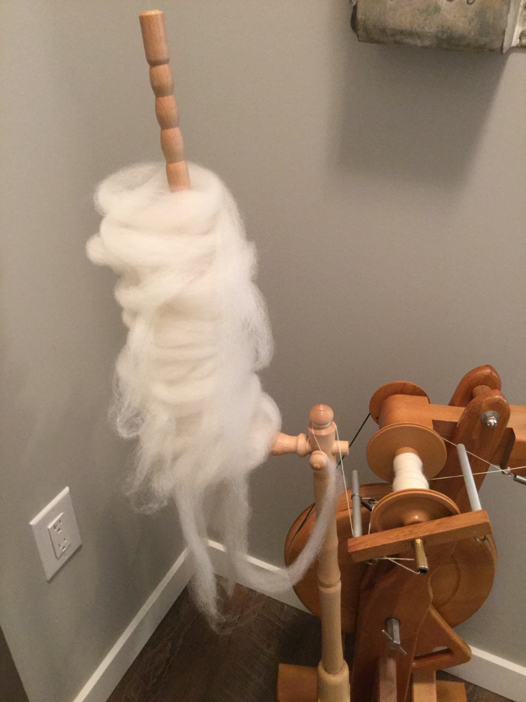 I thought this might give you a gigge. When I wrote the “Dressing my Distaff” post I could not find the photo of how I dressed the distaff before I dizzed handpainted braids in one long strip or thought of adding the twist. This worked fine, but the newest version of distaff dressing as seen below holds more fibre and works much better.