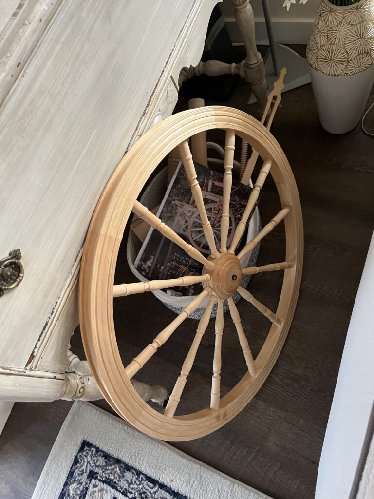 As for the wheel? Hmmm, well, I am in the throes of putting it together, actually. This is a new wheel that I am currently treating to several coats of tung oil. I am hoping to get the the wheel up and runnning by the end of this month so I can dig into some serious spinning. I have the fibre, now I just need the wheel.
